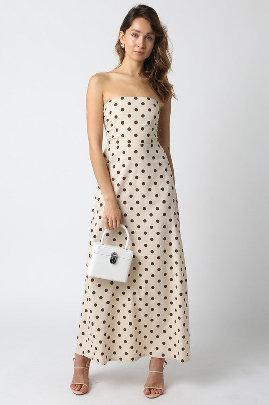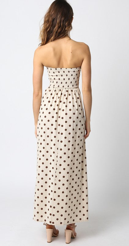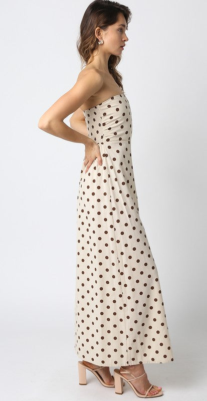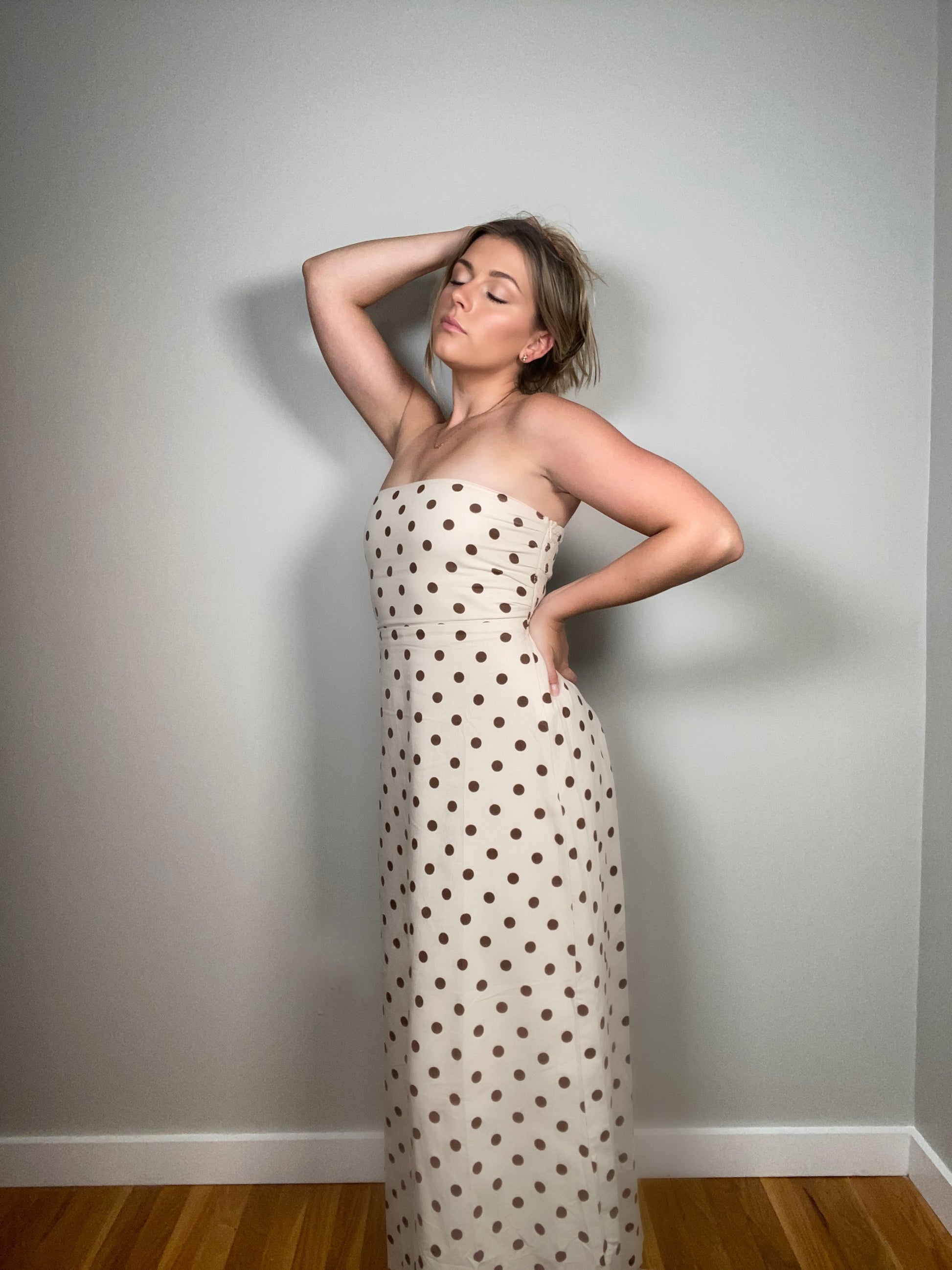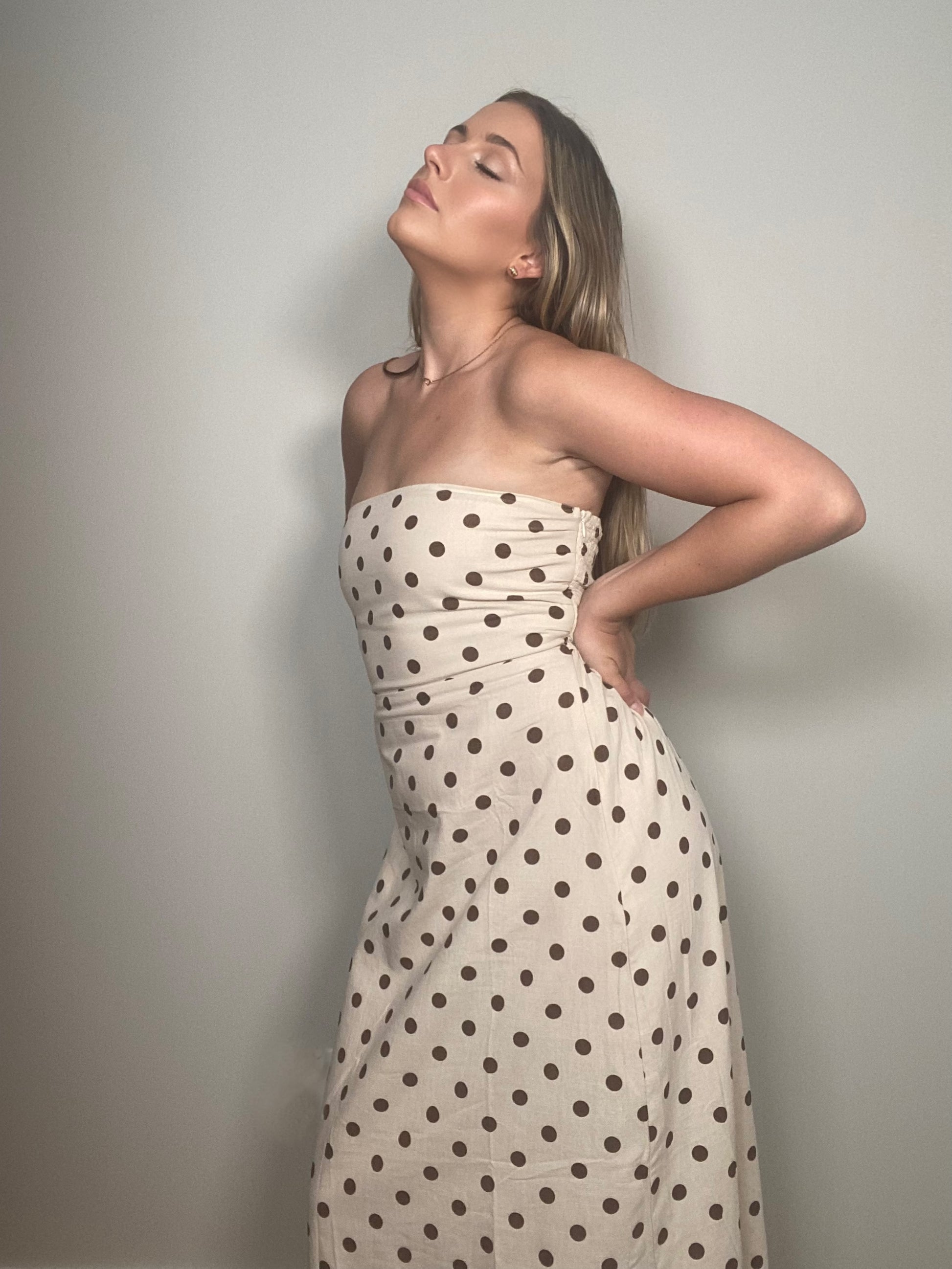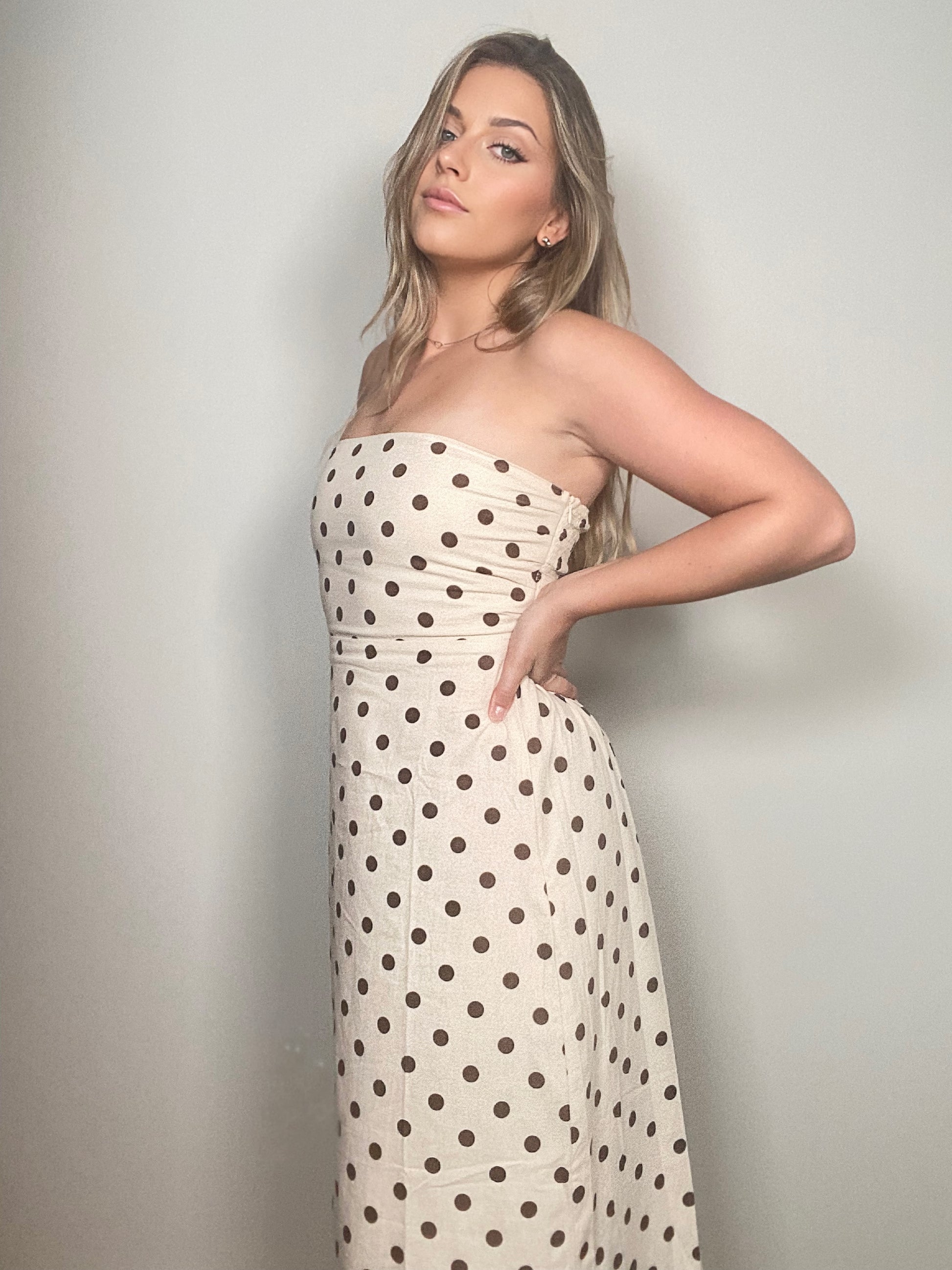 The rich brown hue adds warmth and versatility to the ensemble, while the polka dot pattern and side zipper infuses it with a touch of retro.